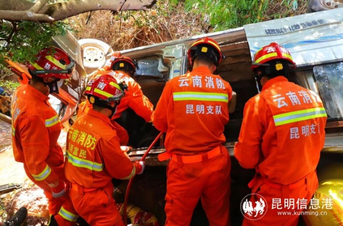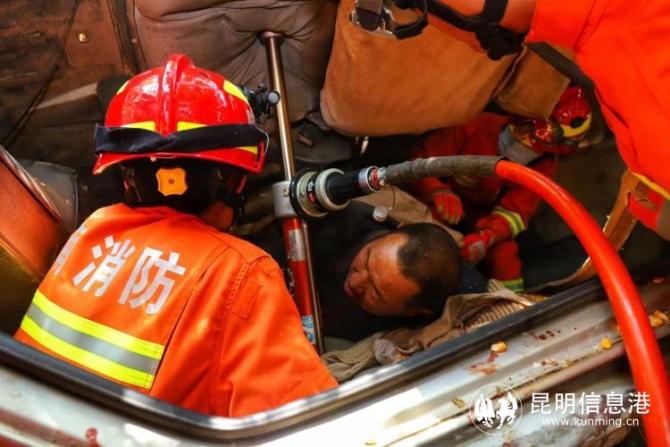 昆明信息港訊 記者勞學麗 通訊員代華超 3月19日12時許,昆明市富民縣九峰山南營村入村路段一輛面包車翻入深溝,駕駛員被困車內(nèi),情況萬分緊急,急需救援。12時14分,富民縣消防救援大隊接到群眾報警后,立即出動1車7人攜帶器材裝備趕赴現(xiàn)場救援。