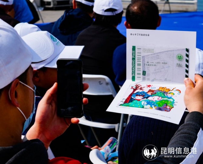 上午十點(diǎn),來自云南大學(xué)附屬中學(xué)一二一小學(xué)部、云南師范大學(xué)附屬小學(xué)呈貢校區(qū)等學(xué)校的小朋友們?cè)诨顒?dòng)現(xiàn)場(chǎng)寫下“春城之邀”明信片,卡紙上的圖片選自昆明市2020年“生物多樣性保護(hù)”環(huán)保公益海報(bào)征集大賽中小朋友們的優(yōu)秀作品——藍(lán)天白云、青山綠水、蟲魚鳥獸......每一張都充滿孩童的想象力與靈氣,作品另一面的留白處則留給小朋友們盡情發(fā)揮??埨飱A著一張透明的“機(jī)票”,上面印著——出發(fā)地:昆明 時(shí)間:2021 航班:COP15。透明“機(jī)票”還是一個(gè)小小的相框,可以框住一張燦爛的笑臉、框住昆明的藍(lán)天白云、框住可愛的紅嘴鷗。