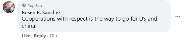 名為“Rosen B. Sanchez”的網(wǎng)友在新華社“臉書”賬號(hào)貼文下回復(fù):“對(duì)于中國(guó)和美國(guó)來(lái)說(shuō),合作和尊重才是正確的道路!”