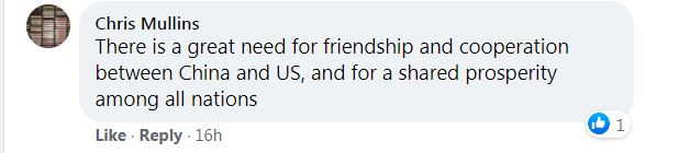 名為“Chris Mullins”的網(wǎng)友同樣在“臉書”上留言說(shuō):“中美之間需要友誼和合作,所有國(guó)家的共同繁榮也有賴于友誼和合作?!?/p>