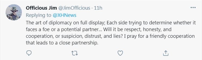 名為“Officious Jim”的網(wǎng)友在新華社推文下回復(fù)說(shuō):“外交的藝術(shù)得到了充分展現(xiàn)。雙方都在試圖判斷對(duì)方是敵人還是伙伴。選擇尊重、誠(chéng)實(shí)以及合作,還是懷疑、不信任以及謊言?我祈禱(中美)能展開友好合作,并最終達(dá)成緊密的伙伴關(guān)系?!?/p>