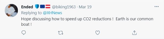 名為“Ended”的網(wǎng)友對(duì)中美加強(qiáng)氣候變化領(lǐng)域?qū)υ捄献骱芷诖?“希望雙方討論了如何加速降低碳排放!我們都在地球這一條船上!”