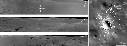 已有研究結(jié)果顯示,位于著陸區(qū)西北方向的織女撞擊坑的一條濺射紋恰好穿過了著陸點附近區(qū)域,而濺射紋內(nèi)常??梢娪蔀R射物形成的二次撞擊坑?!坝裢枚枴毖惨晠^(qū)確實還能觀察到若干個內(nèi)部和周邊均存在碎塊狀物質(zhì)的米級和亞米級的新鮮撞擊坑(如下圖所示)。結(jié)合橢圓撞擊坑的長軸方向推斷,這些新鮮撞擊坑應(yīng)當為織女撞擊坑濺射物形成的二次撞擊坑。