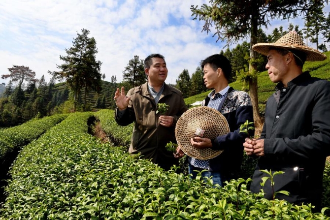 2019年3月26日,在福建省武夷山市星村鎮(zhèn),科技特派員與茶農(nóng)在生態(tài)茶園內(nèi)了解茶葉長(zhǎng)勢(shì)。新華社記者 安希雅 攝
