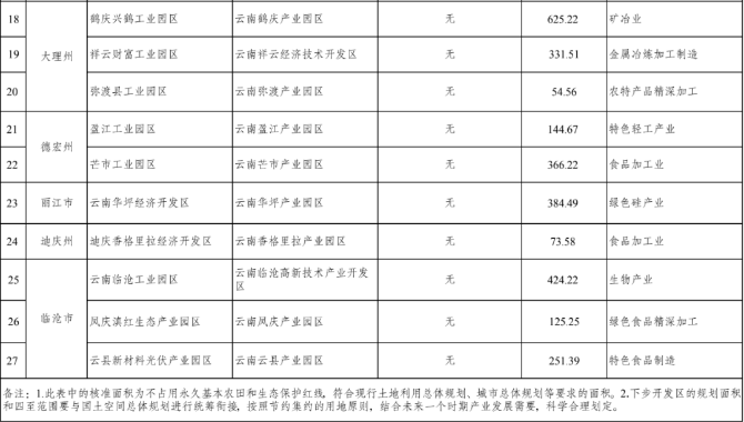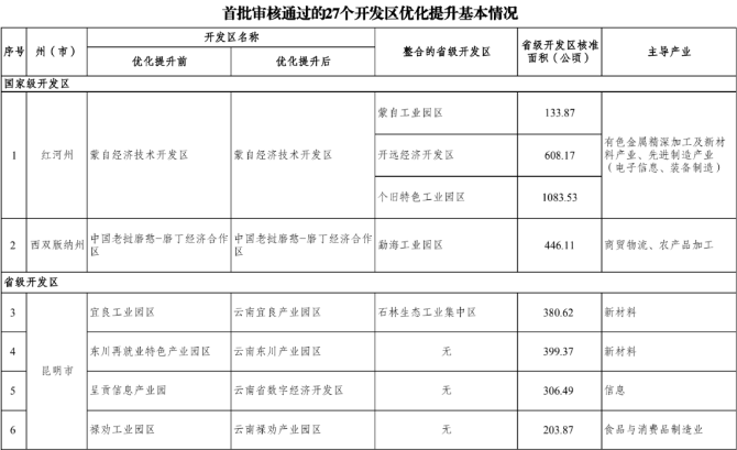 首批審核通過的27個(gè)開發(fā)區(qū)中,國(guó)家級(jí)開發(fā)區(qū)共2個(gè),省級(jí)開發(fā)區(qū)25個(gè),昆明市涉及4個(gè)園區(qū)。其中,宜良工業(yè)園區(qū)整合石林生態(tài)工業(yè)集中區(qū),優(yōu)化提升為云南宜良產(chǎn)業(yè)園,省級(jí)開發(fā)區(qū)核準(zhǔn)面積380.62公頃,主導(dǎo)產(chǎn)業(yè)為新材料。東川再就業(yè)特色產(chǎn)業(yè)園區(qū)優(yōu)化提升為云南東川產(chǎn)業(yè)園區(qū),省級(jí)開發(fā)區(qū)核準(zhǔn)面積399.37公頃,主導(dǎo)產(chǎn)業(yè)為新材料。呈貢信息產(chǎn)業(yè)園優(yōu)化提升為云南省數(shù)字經(jīng)濟(jì)開發(fā)區(qū),省級(jí)開發(fā)區(qū)核準(zhǔn)面積306.49公頃,主導(dǎo)產(chǎn)業(yè)為信息。祿勸工業(yè)園區(qū)優(yōu)化提升為云南祿勸產(chǎn)業(yè)園區(qū),省級(jí)開發(fā)區(qū)核準(zhǔn)面積203.87公頃,主導(dǎo)產(chǎn)業(yè)為食品與消費(fèi)品制造業(yè)。