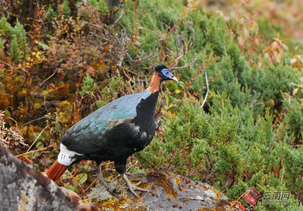 1999年4月,詹姆斯先生帶著希望和真誠再次來到高黎貢山,本來陽光明媚、晴空萬里的夏天,在詹姆斯他們上山后的夜晚卻突然下起了大雪。詹姆斯心想這次又是毫無收獲了。第二天一早,大家正準備查看天氣,打算收拾行囊往回撤離時,高山之上傳來了“咕哩、咕哩”的叫聲,一只大鳥從箭竹叢中飛出,斜著向山坡下滑翔而去。整個時間持續(xù)不到3秒鐘,卻足夠詹姆斯先生清清楚楚地看到了白尾梢虹雉。多年的愿望實現(xiàn),詹姆斯站在原地手舞足蹈,激動得半天說不出話來。