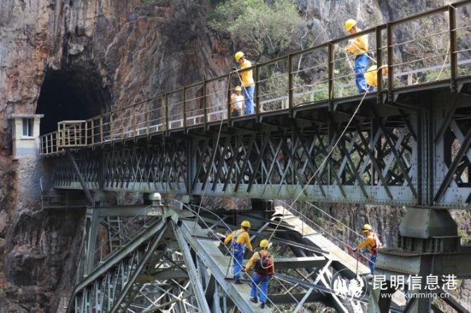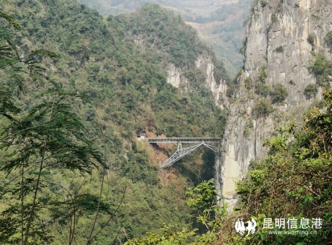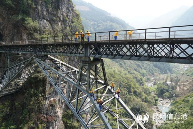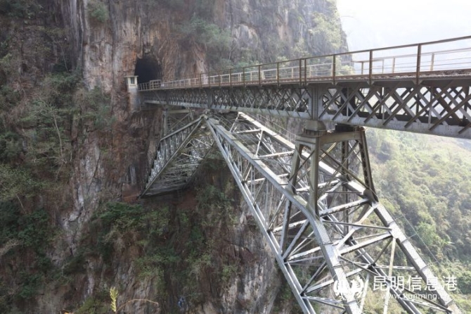 世界聞名的人字橋位于百年米軌滇越鐵路波度箐站與倮姑站之間,橋兩側(cè)是200米高的懸崖峭壁,隧-橋-隧相連,橋面與谷底南溪河支流——四岔河相距100多米。從遠(yuǎn)處看,這座巧奪天工的人字橋仿佛一個(gè)鋼鐵巨人,飛跨于兩山絕壁之上。一百年來(lái),默默承托起滇越鐵路來(lái)來(lái)往往的列車(chē),為云南的政治經(jīng)濟(jì)發(fā)展作出重要貢獻(xiàn)。至今每天還有兩對(duì)中越國(guó)際聯(lián)運(yùn)列車(chē)運(yùn)營(yíng)。