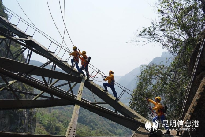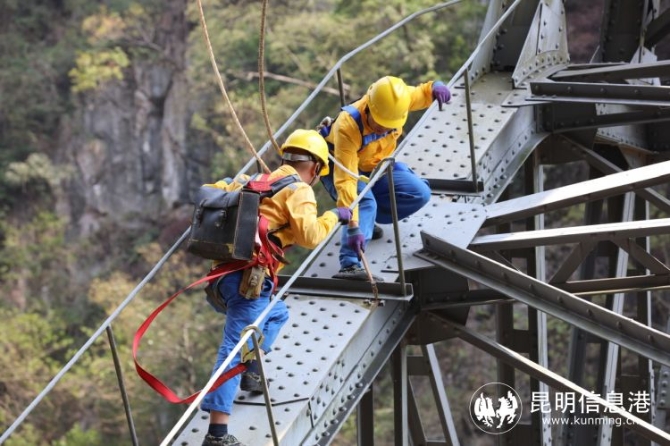 峽谷的風(fēng)吹得懸崖上的樹(shù)枝飄搖,樹(shù)葉“刷刷”作響。腳下百米處,南溪河的一級(jí)支流——四岔河“嘩嘩”流淌。旁人看來(lái)的美景,對(duì)攀爬在橋上的職工來(lái)說(shuō),卻是一種極大的心理考驗(yàn)。