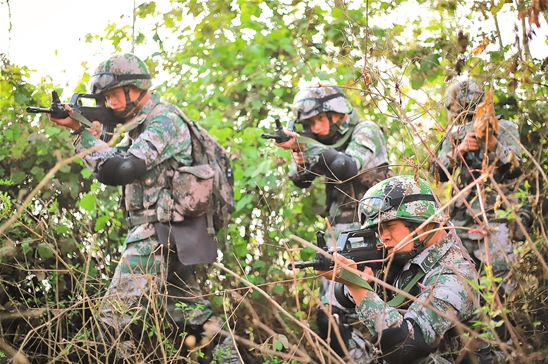 3月中旬,南部戰(zhàn)區(qū)陸軍某邊防旅結(jié)合邊境山岳叢林地帶復(fù)雜多樣環(huán)境,緊貼實(shí)戰(zhàn)開展戰(zhàn)斗演練,讓官兵在復(fù)雜環(huán)境中錘煉過硬軍事本領(lǐng)。圖為該旅十連偵察小組正在執(zhí)行偵察任務(wù)。(云南日?qǐng)?bào) 通訊員曾浩云)