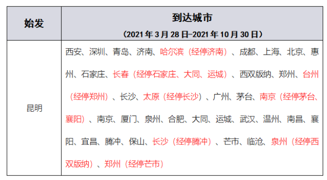 主運營基地昆明方面,換季后昆航將新開KY3077/3078次“昆明-西雙版納-泉州”航班,每周二、四、六執(zhí)飛;復航KY8287/88次“昆明-武漢”航班,每周一、三、五、七執(zhí)飛;“昆明-石家莊”調(diào)整為KY8249/50次“昆明-石家莊-長春”航班,每天執(zhí)飛;“昆明-長沙”調(diào)整為KY3002/01次“昆明-長沙-太原”航班,每天執(zhí)飛;KY8269/70次“昆明-北京”航班將繼續(xù)為購買客票的旅客提供餐食服務;同時2021年4月1日起,昆航空將在“昆明-北京”、“昆明-上?!焙骄€中為公務艙旅客提供選餐服務,具體可至昆明航微信公眾號或昆明航官網(wǎng)了解,昆明基地通航城市如下所示: