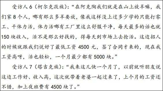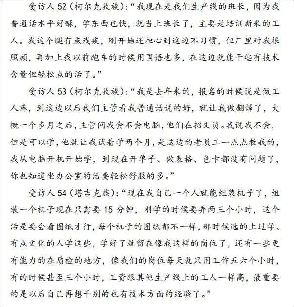 兩人通過焦點(diǎn)小組訪談、深度訪談、參與式觀察等研究方法,對(duì)廣東省內(nèi)5家聘用新疆少數(shù)民族工人的企業(yè)開展調(diào)查,其中2家正是“ASPI報(bào)告”中所提及的企業(yè)。參與具體訪談的包括維吾爾族、哈薩克族、柯爾克孜族、塔吉克族等在內(nèi)的新疆少數(shù)民族務(wù)工人員共計(jì)70人,可謂十分細(xì)致全面。