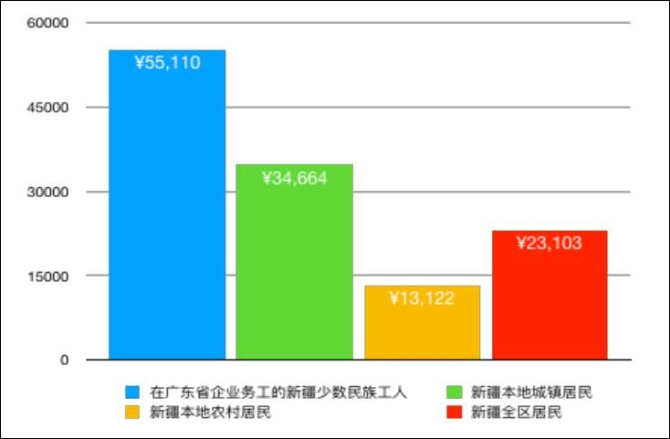 尼羅拜爾和陳寧通過對(duì)5家企業(yè)的474名新疆少數(shù)民族工人調(diào)研發(fā)現(xiàn),他們?cè)趦?nèi)地企業(yè)的人均年收入為55110元(以11個(gè)月計(jì)算,新疆籍工人每年有一個(gè)月探親假),即便是工資最低的新疆少數(shù)民族廚師的年收入也可達(dá)到38500元。