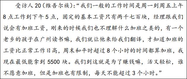 尼羅拜爾和陳寧的調(diào)研報(bào)告顯示,在內(nèi)地務(wù)工的新疆少數(shù)民族工人每天正常的工作時(shí)間大多為8個(gè)小時(shí)(部分技術(shù)類崗位工作時(shí)間更短),分為白班和夜班兩個(gè)班次,在企業(yè)訂單較多時(shí)會(huì)在法律規(guī)定范圍內(nèi)有額外的加班,除了加班和夜班有額外的工資和補(bǔ)貼,技術(shù)類崗位也有績(jī)效工資。