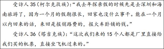 可以看出,新疆少數(shù)民族群眾出疆務(wù)工完全是自主選擇;平等就業(yè)、勞動(dòng)報(bào)酬、節(jié)假日休假、休息日休假等勞動(dòng)權(quán)利都得到了充分保障;飲食習(xí)慣、子女教育、探親休假和往返交通等方面得到了更多照顧。