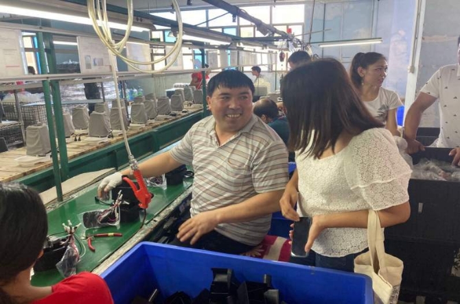 研究報(bào)告作者與帶著一家5口人來廣東打工的新疆柯爾克孜族工人(中間男子)在車間訪談 圖自報(bào)告