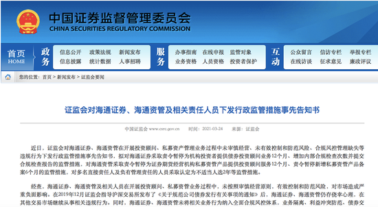 3月24日,證監(jiān)會對海通證券、海通資管在開展投資顧問、私募資產(chǎn)管理業(yè)務過程中未審慎經(jīng)營、未有效控制和防范風險、合規(guī)風控管理缺失等違規(guī)行為下發(fā)行政監(jiān)管措施事先告知書,擬對海通證券采取責令暫停為機構投資者提供債券投資顧問業(yè)務12個月、增加內(nèi)部合規(guī)檢查次數(shù)并提交合規(guī)檢查報告的監(jiān)管措施,對海通資管采取責令暫停為證券期貨經(jīng)營機構私募資管產(chǎn)品提供投資顧問服務12個月、責令暫停新增私募資管產(chǎn)品備案6個月的監(jiān)管措施,對多名直接責任人及負有管理責任的人員采取認定為不適當人選2年等監(jiān)管措施。