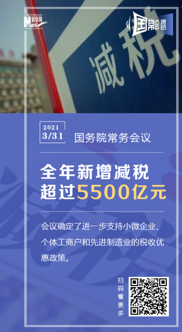 新華網(wǎng)北京4月1日電 3月31日召開(kāi)的國(guó)務(wù)院常務(wù)會(huì)議,圍繞更大激發(fā)市場(chǎng)主體活力、增強(qiáng)發(fā)展后勁,推出深化“放管服”改革新舉措;部署推進(jìn)減稅降費(fèi),落實(shí)和優(yōu)化對(duì)小微企業(yè)和個(gè)體工商戶等的減稅政策。會(huì)議確定了進(jìn)一步支持小微企業(yè)、個(gè)體工商戶和先進(jìn)制造業(yè)的稅收優(yōu)惠政策。該政策加上已出臺(tái)稅收優(yōu)惠政策,預(yù)計(jì)全年新增減稅超過(guò)5500億元。