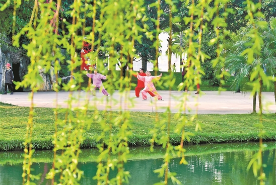 圖為市民在城區(qū)柳園里鍛煉。