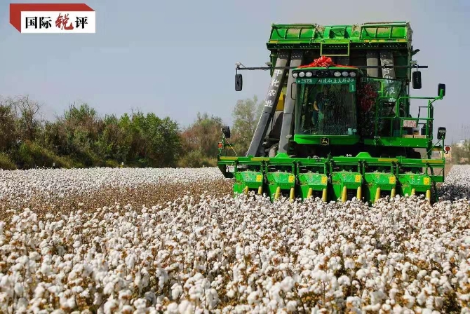 這幾天,大型采棉機在中國新疆廣闊棉田里工作的視頻走紅網(wǎng)絡。這是對所謂新疆采棉業(yè)存在“強迫勞動”謠言的最有力回擊。那些盲目跟風抵制新疆棉花的企業(yè),應當擦亮眼睛、明辨是非,不要淪為美西方反華勢力的政治工具。