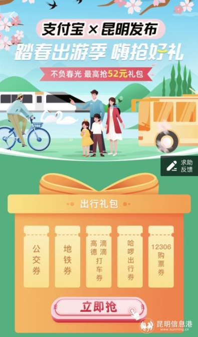 此前,為方便市民花期出行踏春,支付寶x哈啰出行聯(lián)合推出了昆明人專屬的“踏春出游季”大禮包,一直持續(xù)至4月30日每周都會有出行禮包領(lǐng)取,而且最高可領(lǐng)52元。昆明市民只要打開支付寶,在搜索欄輸入“昆明發(fā)布”即可領(lǐng)取“出行禮包”?;顒?dòng)期間,每人每周享有一次抽獎(jiǎng)機(jī)會。用戶進(jìn)入活動(dòng)頁面后,點(diǎn)擊“立即搶”按鈕即可抽取獎(jiǎng)品,哈啰出行順風(fēng)車乘客券.....就看誰的速度快。