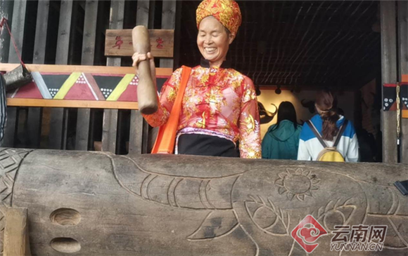 少數(shù)民族游客敲擊司莫拉木鼓 記者秦黛玥/攝