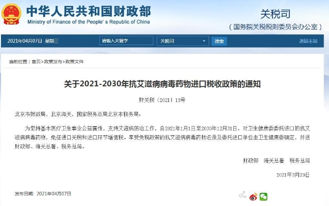 據財政部官網消息,日前,財政部 、海關總署 、稅務總局聯(lián)合發(fā)布《關于2021-2030年抗艾滋病病毒藥物進口稅收政策的通知》,《通知》稱,自2021年1月1日至2030年12月31日,對衛(wèi)生健康委委托進口的抗艾滋病病毒藥物,免征進口關稅和進口環(huán)節(jié)增值稅。