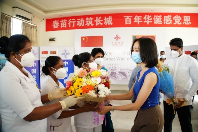 4月5日,在科倫坡港口城接種點,一名中國公民代表向當(dāng)?shù)蒯t(yī)護人員獻花致謝。新華社 記者唐璐/攝