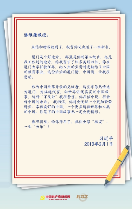 2019年2月1日,習(xí)近平總書記給潘維廉教授回信,祝賀新書出版。“你在廈門大學(xué)任教30年,把人生的寶貴時(shí)光獻(xiàn)給了中國的教育事業(yè),這份濃濃的廈門情、中國情,讓我很感動(dòng)?!毙胖?,習(xí)近平總書記對(duì)他表達(dá)真誠謝意,并表示“我相信,你將會(huì)見證一個(gè)更加繁榮進(jìn)步、幸福美好的中國,一個(gè)更多造福世界和人類的中國,你筆下的中國故事也一定會(huì)更精彩”。
