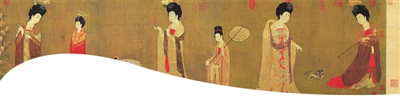 《簪花仕女圖》(局部),傳為唐代周昉繪制,粗絹本設(shè)色畫,原畫藏于遼寧省博物館。根據(jù)畫作中的服飾、花冠等,學界有專家認為此畫為宋代或更晚據(jù)唐人舊稿而作。遼寧省博物館供圖