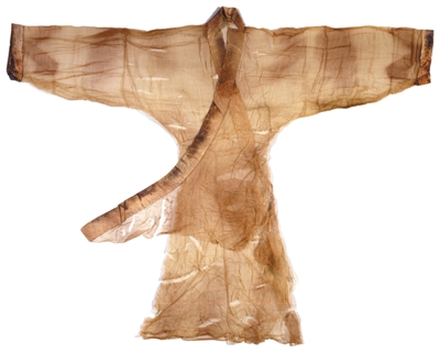 湖南省長沙市馬王堆一號漢墓出土的素紗襌衣。此件素紗襌衣為交領(lǐng),右衽,直裾,面料為素紗,邊緣為幾何紋絨圈錦。湖南省博物館供圖