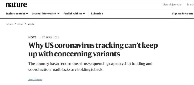 這篇名為《為何美國新冠病毒追蹤跟不上令人焦慮的病毒變異》的文章表示,3月份美國在全球流感共享數(shù)據(jù)庫(GISAID)的在線基因組存儲(chǔ)庫中,上傳共享的新冠病毒基因組數(shù)量僅代表了美國當(dāng)月新冠確診病例數(shù)的1.6%。根據(jù)該數(shù)據(jù)庫統(tǒng)計(jì),美國在疫情期間的基因組測序工作,至少落后了30個(gè)國家和地區(qū)。