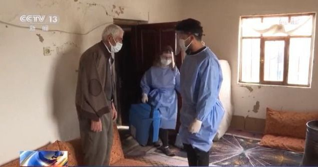 醫(yī)護人員向老人解釋了相關(guān)注意事項后為他接種了第一劑中國新冠疫苗。此前,醫(yī)護人員曾經(jīng)兩次嘗試來到伊德里斯家為他接種,但因為天氣惡劣、道路封閉而被迫放棄。
