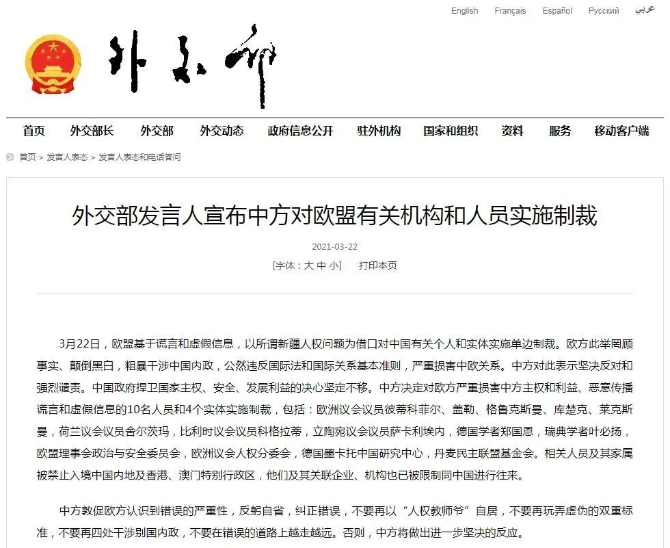 當(dāng)夜,中國外交部負(fù)責(zé)人分別緊急召見歐盟、英國駐華大使,就幾小時(shí)前對(duì)方借所謂新疆人權(quán)問題作出單邊對(duì)華制裁決定提出嚴(yán)正抗議和強(qiáng)烈譴責(zé),與此同時(shí)也向美方和加方提出嚴(yán)正交涉。