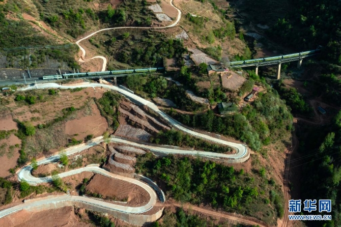 這是即將抵達(dá)成昆鐵路沙馬拉達(dá)站的5634次列車和通站公路(4月11日攝,無人機(jī)照片)。
