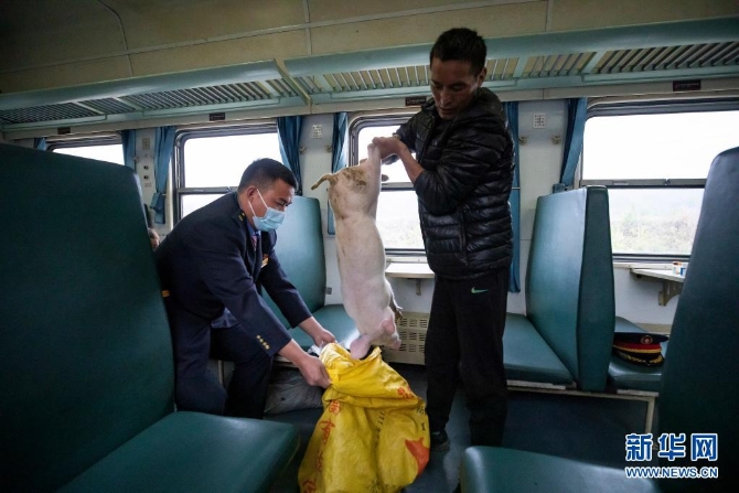 來自越西縣蘇姑鄉(xiāng)的彝族乘客吉木木加(右)帶上火車的小豬從袋子里爬了出來,中國(guó)鐵路成都局集團(tuán)公司成都客運(yùn)段5633次彝族列車員俄木日古幫他把小豬重新裝好(4月11日攝)。5633/5634次列車特別配備了6名彝族列車員,以更好地為當(dāng)?shù)匾妥灏傩辗?wù)。新華社記者 沈伯韓 攝