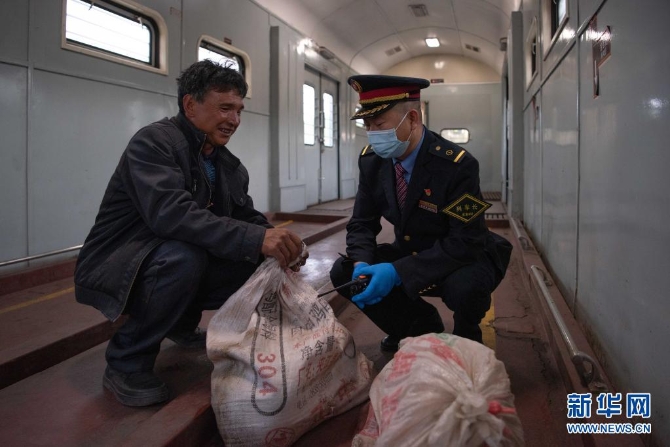 在5633次列車的“行李車廂”內(nèi),中國(guó)鐵路成都局集團(tuán)公司成都客運(yùn)段5633/5634次列車長(zhǎng)劉偉(右)了解村民攜帶牲畜情況(4月11日攝)。新華社記者 胥冰潔 攝