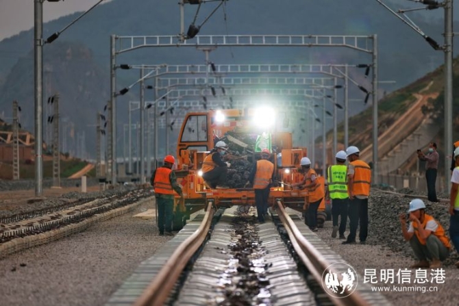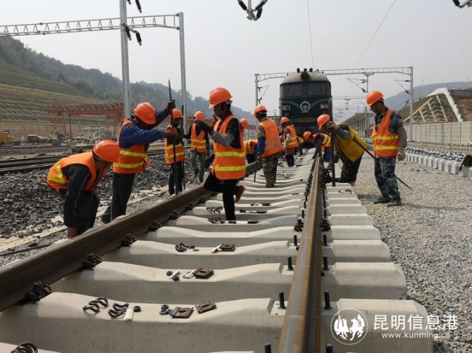 采用兩臺鋪軌機(jī)上下行線路同時鋪軌,2月中旬開始增加磨憨至玉溪方向反向人工鋪軌作業(yè),晝夜施工,鋪軌抵達(dá)普洱,實(shí)現(xiàn)鋪軌過半目標(biāo)。