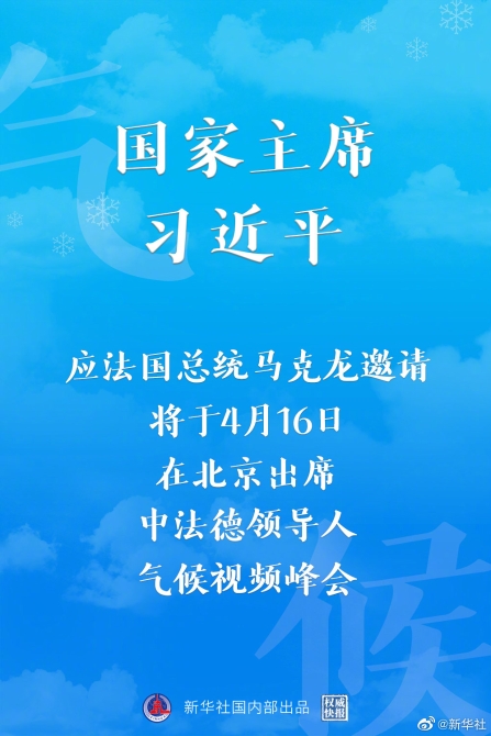 外交部發(fā)言人華春瑩15日宣布:應(yīng)法國總統(tǒng)馬克龍邀請,國家主席習(xí)近平將于4月16日在北京出席中法德領(lǐng)導(dǎo)人氣候視頻峰會。