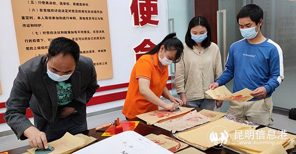 在“紅軍長征過昆明”系列展板旁還有非物質(zhì)文化拓印體驗(yàn)。聽聞拓印是我國一項(xiàng)古老的傳統(tǒng)技藝,使用宣紙和墨汁,將碑文、器皿上的文字或圖案,清晰地拷貝出來的一種技能,在諸多傳統(tǒng)中國文化技藝的傳承中有著無可比擬的特殊地位,大家都頗感興趣,躍躍欲試。在志愿者講述了拓印的具體操作方法后,機(jī)關(guān)青年都動手操作,親身感受拓印的非遺文化魅力。