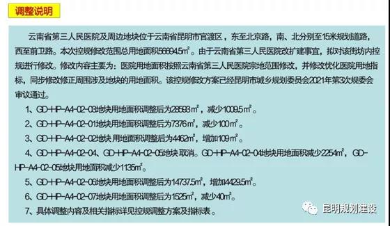 醫(yī)院用地面積按照云南省第三人民醫(yī)院宗地范圍修改,并修改優(yōu)化醫(yī)院用地指標,同步修改修正周圍涉及地塊的用地面積。