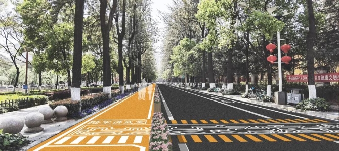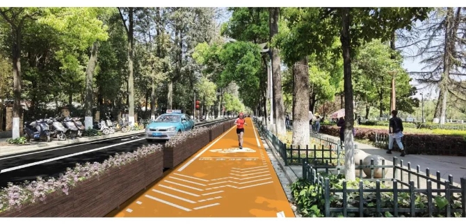 翠湖慢行跑道設(shè)計內(nèi)容主要以橙黃色為跑道顏色,底部涂層采用水性環(huán)氧改性樹脂,罩面采用是水性聚氨酯涂料,具有耐久性好、厚度小、環(huán)保等優(yōu)勢;其次,采用自發(fā)光涂料噴涂標識標線,并將里程數(shù)、記事年份等納入標識內(nèi)容同步施劃;采用木質(zhì)隔離花箱與機動車道分隔,并用感應(yīng)燈和燈帶進行照明裝飾。為確保工程的知曉率和民主性,前期區(qū)城市管理局已發(fā)放《關(guān)于翠湖環(huán)路非機動車道改為逆時針單向通行的民意問卷調(diào)查表》征求市民建議,同時為確保交通安全、有序,將非機動車道改為逆時針單向行駛,并發(fā)布《實行翠湖環(huán)路非機動車單向通行管理的公告》。