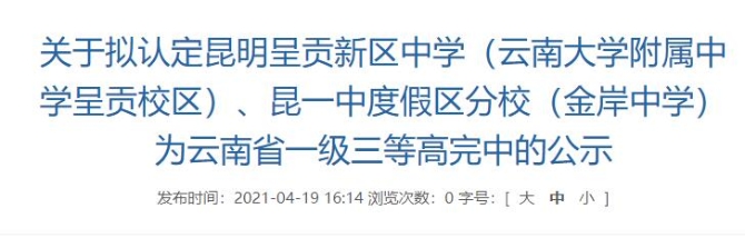 昆明信息港訊 記者上官艷君 4月19日,記者從昆明市教育體育局官網(wǎng)獲悉,在學(xué)校自評(píng)、區(qū)教育體育局初評(píng)和市級(jí)專家初勘基礎(chǔ)上,市政府教育督導(dǎo)委員會(huì)辦公室組織專家進(jìn)行了復(fù)評(píng),經(jīng)昆明市教育體育局局務(wù)會(huì)審議通過(guò),擬認(rèn)定昆明呈貢新區(qū)中學(xué)(云南大學(xué)附屬中學(xué)呈貢校區(qū))、昆一中度假區(qū)分校(金岸中學(xué))為云南省一級(jí)三等高完中。
