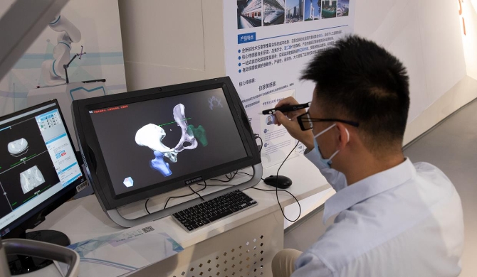 一名參觀者正在體驗(yàn)VR手術(shù)規(guī)劃系統(tǒng)。該系統(tǒng)可在虛擬現(xiàn)實(shí)環(huán)境下重建病灶部位的3D仿真模型,輔助外科醫(yī)生制定手術(shù)方案。人民日報記者 朱笑熺、朱瑛琪攝