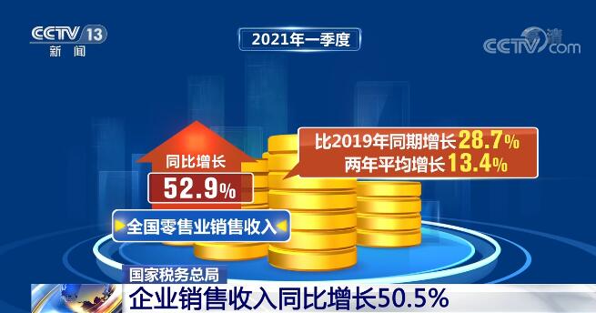國家稅務(wù)總局增值稅發(fā)票數(shù)據(jù)顯示,2021年一季度,全國企業(yè)銷售收入同比增長50.5%,比2019年同期增長27.2%,兩年平均增長12.8%。