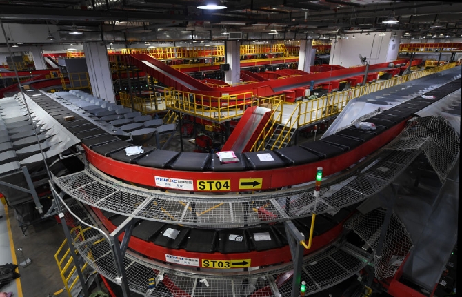 快遞在順豐天津全自動(dòng)中轉(zhuǎn)樞紐內(nèi)的全自動(dòng)分揀設(shè)備上傳輸。(新華社記者趙子碩攝)