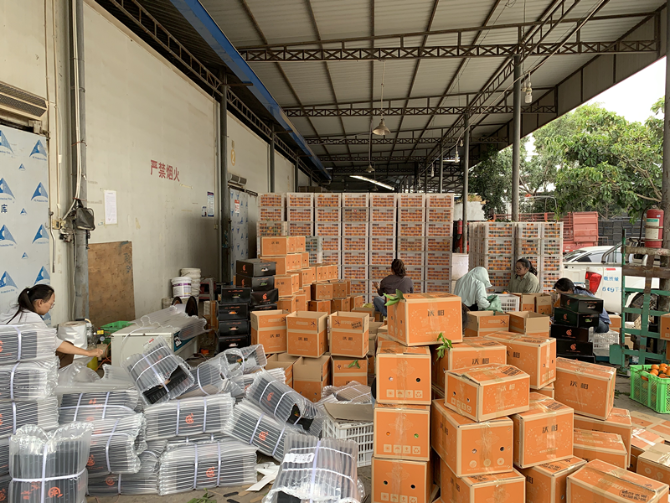 在水果分揀、包裝車間里,工人們正在給分了等級的沃柑裝箱