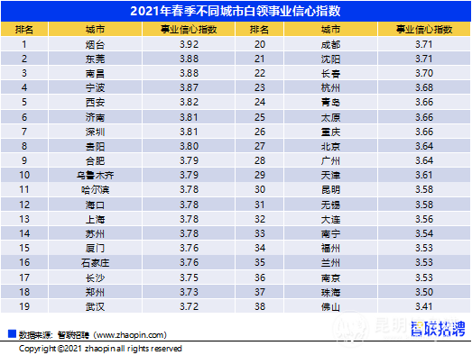 接受調(diào)研者中,昆明地區(qū)有50.7%的白領(lǐng)對(duì)2021年事業(yè)取得成就懷抱信心,同比擴(kuò)張8.4個(gè)百分點(diǎn),信心指數(shù)也由去年春季的3.12上升至3.58,雖然低于全國水平3.70,但在全國38個(gè)核心城市中仍排在第30名。