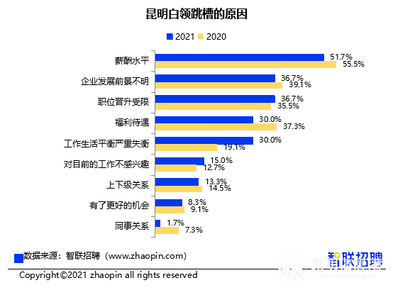 《智聯(lián)招聘2021年春季昆明白領(lǐng)跳槽指數(shù)調(diào)研報(bào)告》近日發(fā)布,其中指出,昆明白領(lǐng)事業(yè)信心指數(shù)為3.58,同比上升,全國排名第30位。昆明白領(lǐng)計(jì)劃跳槽的占比同比下降,但成功收獲Offer(錄取通知)的比例提升至8.7%。