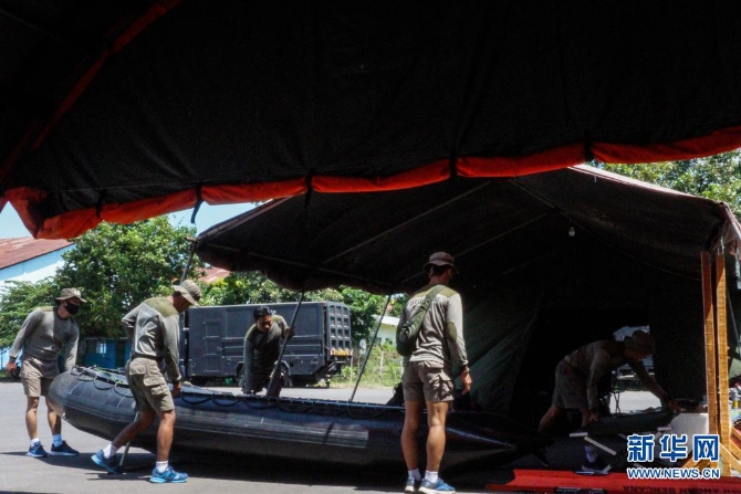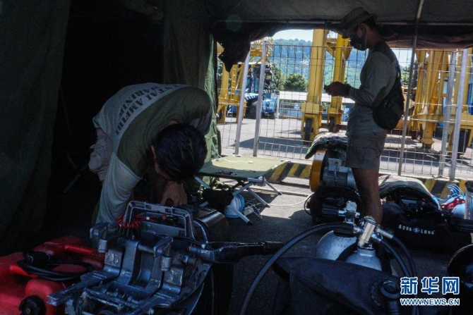 4月25日,搜救人員在印度尼西亞東爪哇省外南夢(mèng)準(zhǔn)備參與搜尋失聯(lián)潛艇的工作。(庫爾尼亞萬/攝)