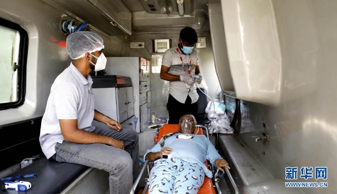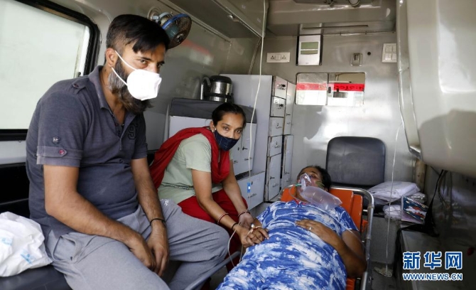 4月26日,一名新冠患者在印度艾哈邁達巴德的一輛救護車上接受治療。